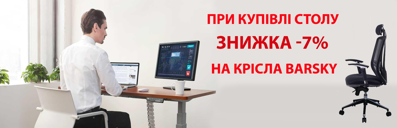 При купівлі будь-якого столу Loctek Ви отримуєте гарантовану Знижку -7% на будь-яке крісло Barsky. А також ви отримаєте безкоштовну доставку і столу і крісла по всій Україні.